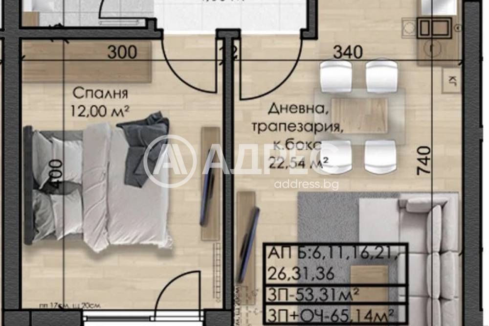 Апартамента се намира на ет.4/10 изложение север/запад със застр.площ от 53.31 кв.м 65.14 кв.м с общи части. Състои се от антре 4 кв.м, дневна с кухненски бокс 22.57кв.м ,спалня 12 кв.м с тераса 3.20 кв.м и баня с тоалетна 3.01 кв.м. Посочените квадратури са чистата светла площ на помещенията. Има апартаменти със същото разпределение и на горните етажи,като цената е според етажа. Отоплението предвидено за всеки 1 ап е с изводи за индивидуални газови котлета и изградени трасета за климатици сплит система във всяка стая и изводи за главния климатик на терасата. В градата има още много варианти на 2стайни и 3 стайни апартаменти, като съществува и вариант за обединение на апартаменти. Сградата е след акт 14. Правят се фасадите,които са окачени и се работи по общите части.Сградата ще бъде предадена с акт 16 до началото на м. Декември 2026г