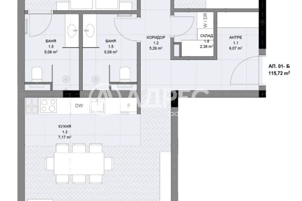 Тристаен апартамент със следното разпределение: коридор, дневна с кухненски бокс, две спални, две бани с тоалетна, складово помещение и тераса.