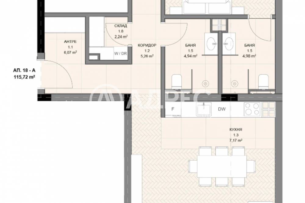 Тристаен апартамент със следното разпределение: коридор, дневна с кухненски бокс, две спални , две бани с тоалетна и две тераси.
