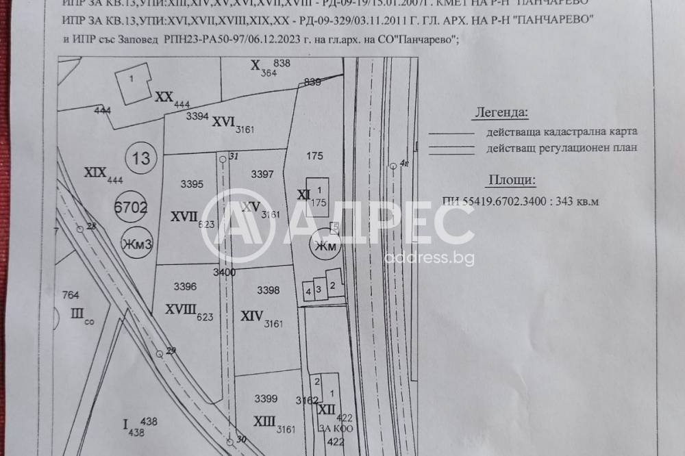 Административен район (СО) Панчарево. Устройствена зона Жм3. Приета с: Решение № 67 на СОС от 14.02.2019 г. Плътност на застрояването 20%. КИНТ (коеф. на интензивност на застрояването) 0.5. Мин. озеленена площ 70%. Кота корниз 7м.