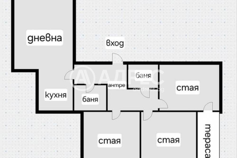 Разпределение: входно антре, всекидневна с трапезария и кухненски бокс, три големи спални, две бани с тоалетни и тераса.
