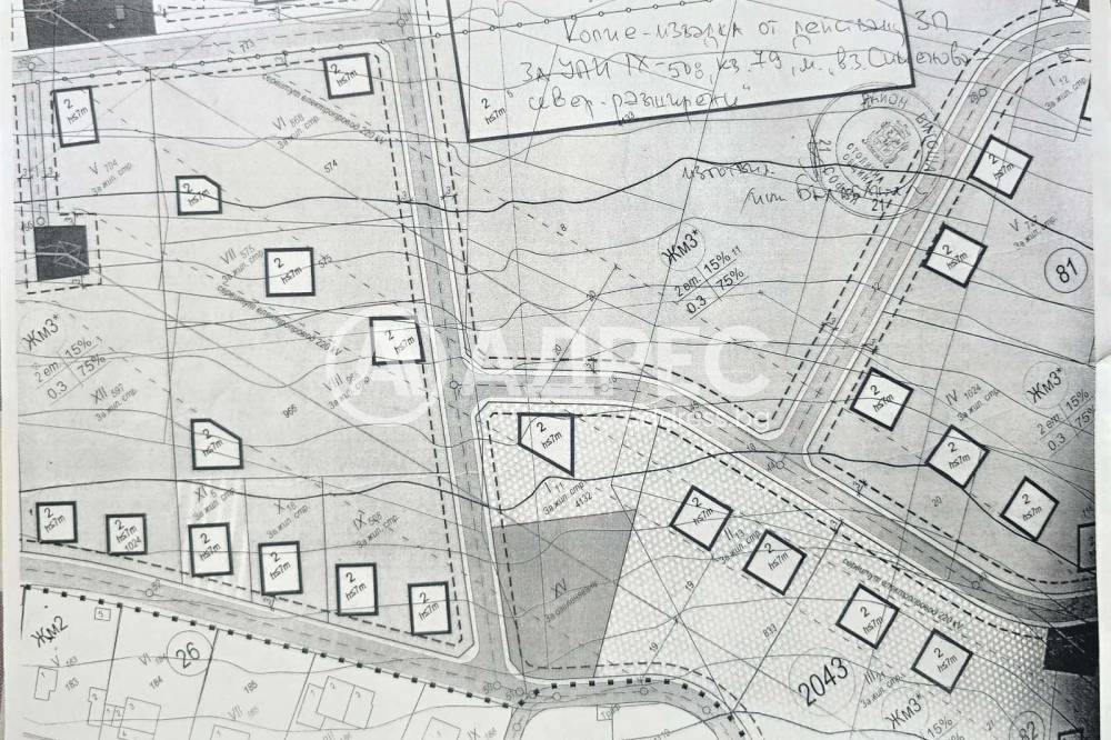 Парцел в Симеоново с лека денивелация. Зона Жм 3, параметри за застрояване: плътност 20, кинт 0,3/0,5, кота корниз - 7,5 м, има ПУП за две къщи с височина 7 м.