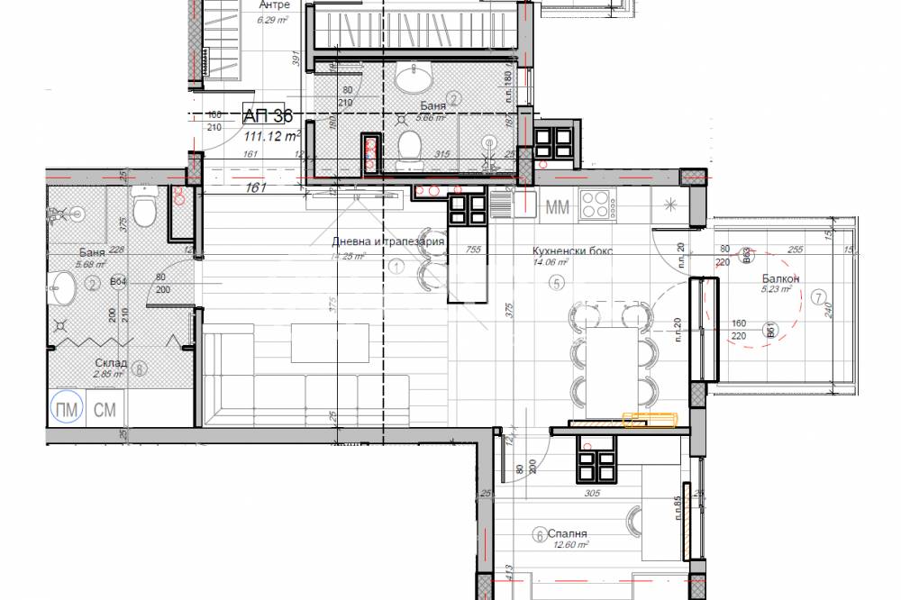 Разкошен многостаен апартамент на шести последен етаж. Жилището е с РЗП-116,56м2 и ЗП-111,12м2. Изключително компактно жилище с отлично разпределение: антре, дневна с кухненски бокс и трапезария-28,31м2 с излаз на балкон-5,23м2, две спални-13,031м2 и 12,60м2, кабинет-7,94м2, две бани с тоалетни и склад. Налични ПМ и гаражи. Цени с ДДС. Без комисион.