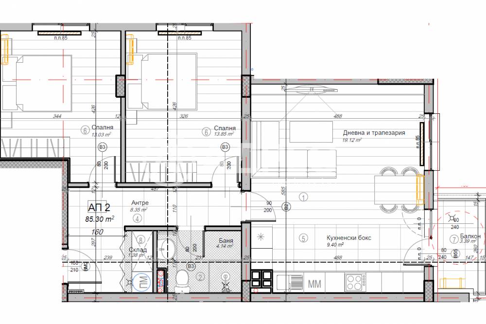 Разкошен тристаен апартамент на първи етаж над партер на кота +2,85м. Жилището е с РЗП-97,67м2 и ЗП-85,30м2. Изключително компактно жилище с отлично разпределение; антре, дневна с кухненски бокс и трапезария-28,52м2 с излаз на тераса, две спални-13,03м2 и 13,85м2, баня с тоалетна-4,14м2 и склад. Налични ПМ и гаражи. Цените са крайни с включен ДДС. Без комисион.
