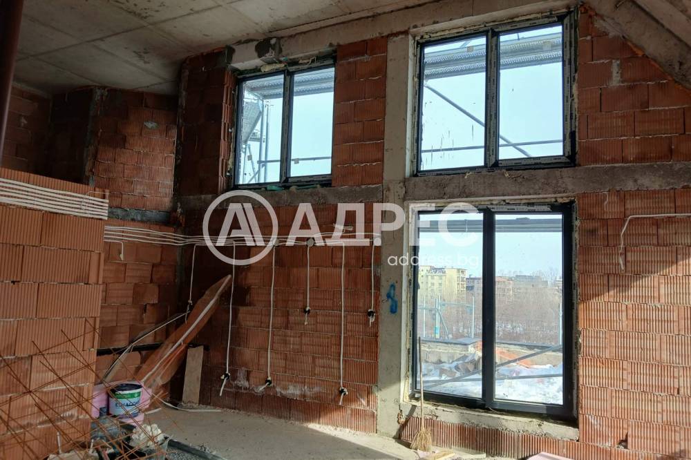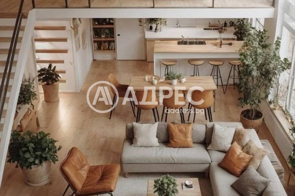 Разпределение ниво 1: Коридор, складово помещение, спалня, баня с тоалетна, просторна дневна зона с големи прозорци и височина на тавани 4.55 м. - много светла и слънчева част. Всекидневната е 30 кв.м., спалнята 14 кв.м.