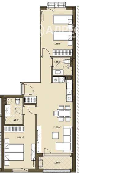Жилищата са с 1 и 2 спални, непреходни, с добри изложения и правилни стаи. Всички тристайни апартаменти са с две бани и тоалетни. На все етаж са разположени по само 4 имота / 2 двустайни и 2 тристайни /, което е предпоставка за тихо съжителство и слаба амортизация на общите части на блока.