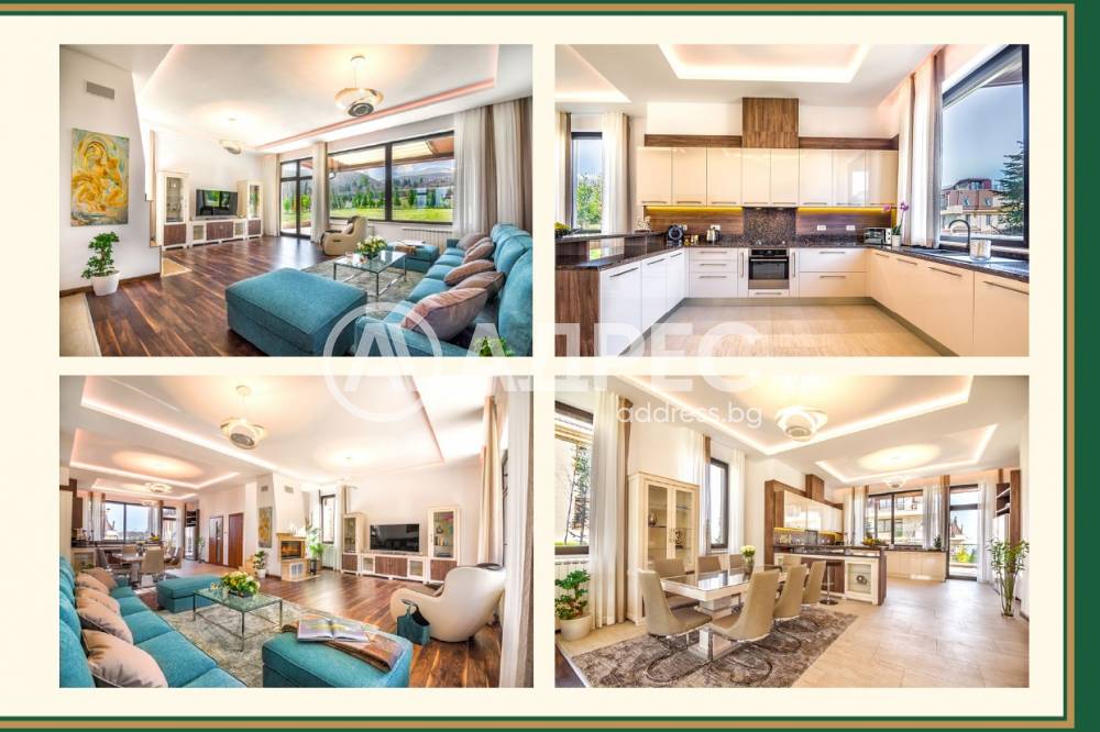 Къщата е напълно обзаведена и включва хол с камина, трапезария и кухня с килер, две веранди, 4 спални със собствена баня, гардеробно помещение и балкон, както и сауна, фитнес, гараж за две коли и външни паркоместа.