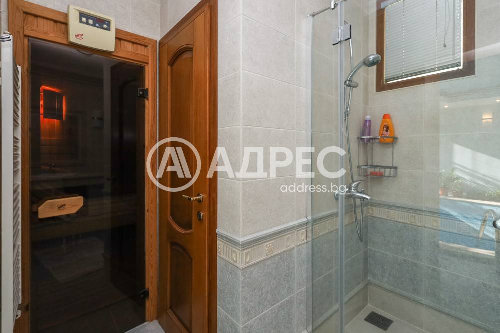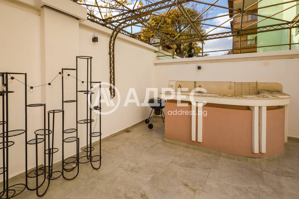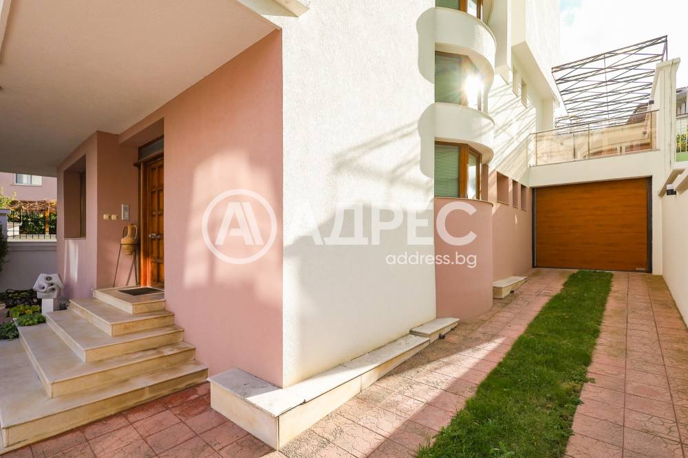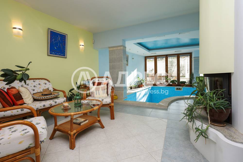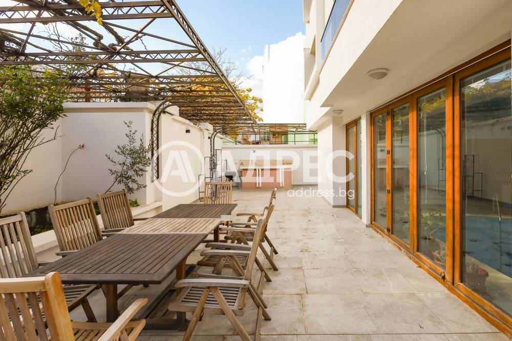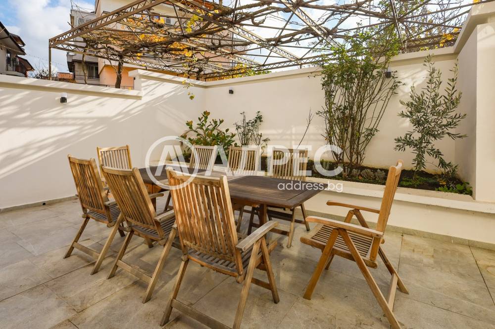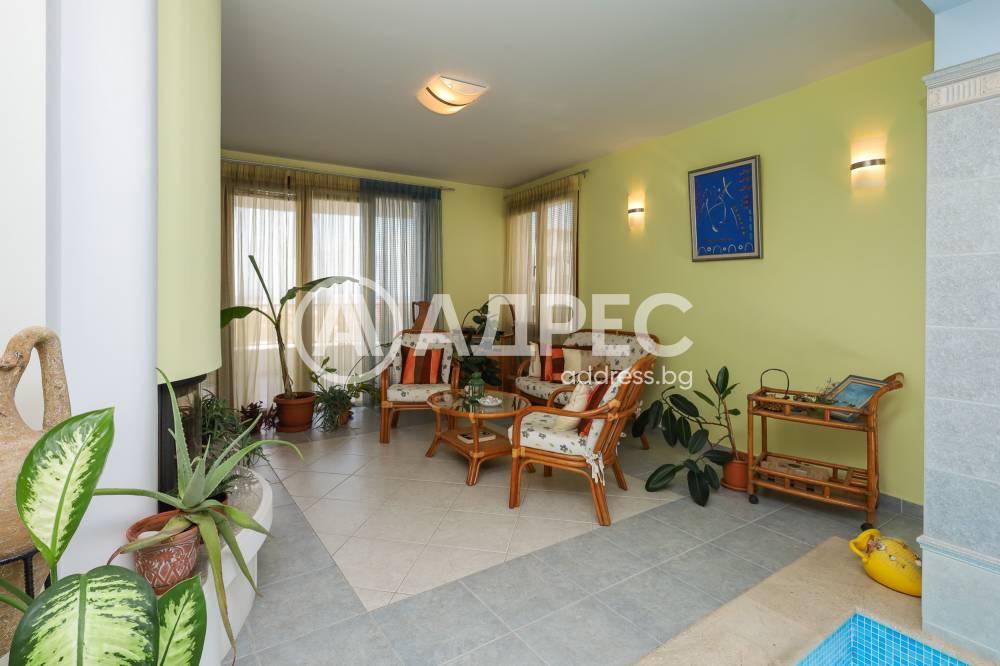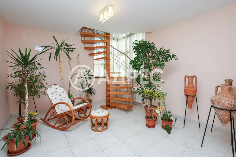 партер (1-ви етаж) – дневна с каминаq зимна градина с излаз към голяма тераса – веранда с панорамна гледка към морето и града. На този етаж има басейн, сауна и санитарни помещения. Площ 121,93 кв. м.
