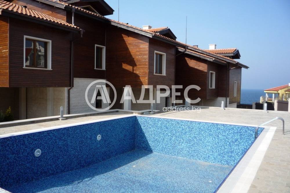 Двуетажна къща /таунхаус/ Буджака, гр. Созопол. Затворен комплекс от 4 къщи с площ от 1049 к. м., басейн и подземен гараж. Обзаведена.