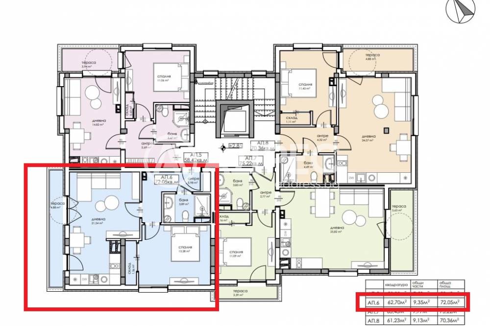 Двустаен апартамент с площ 72,05 кв. м., етаж 2 от 4, асансьор. Състои се от антре, дневна с кухненски кът и тераса, спалня, баня с тоалетна и складово помещение.