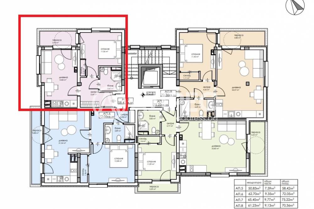 Двустаен апартамент с площ 75,22 кв. м., етаж 2 от 4, асансьор. Състои се от антре, дневна с кухненски кът и спалня с обща тераса за двете поомещения, баня с тоалетна и складово помещение.