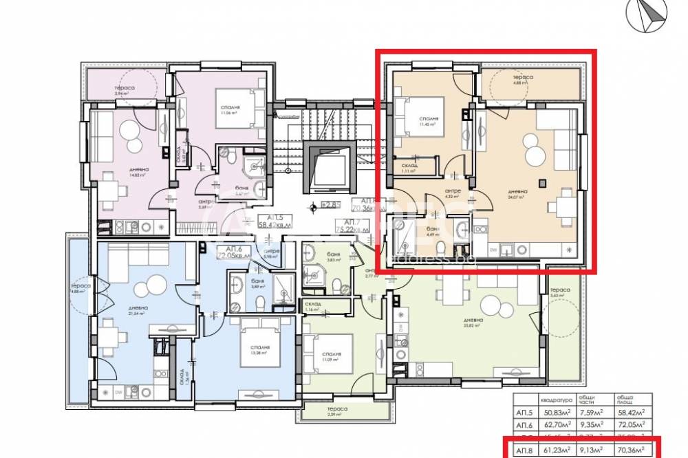 Двустаен апартамент с площ 70,36 кв. м., етаж 2 от 4, асансьор. Състои се от антре, дневна с кухненски кът и спалня с обща тераса за двете поомещения, баня с тоалетна и складово помещение.