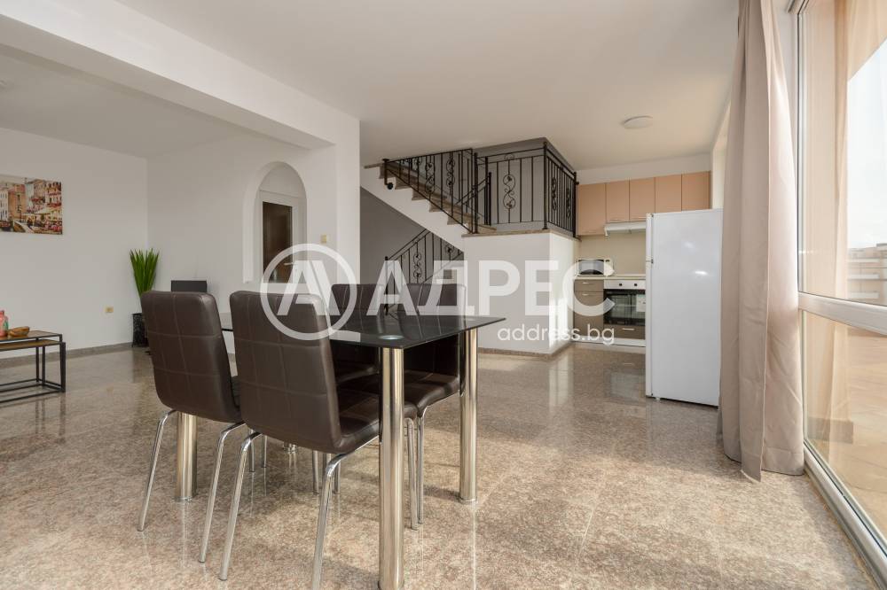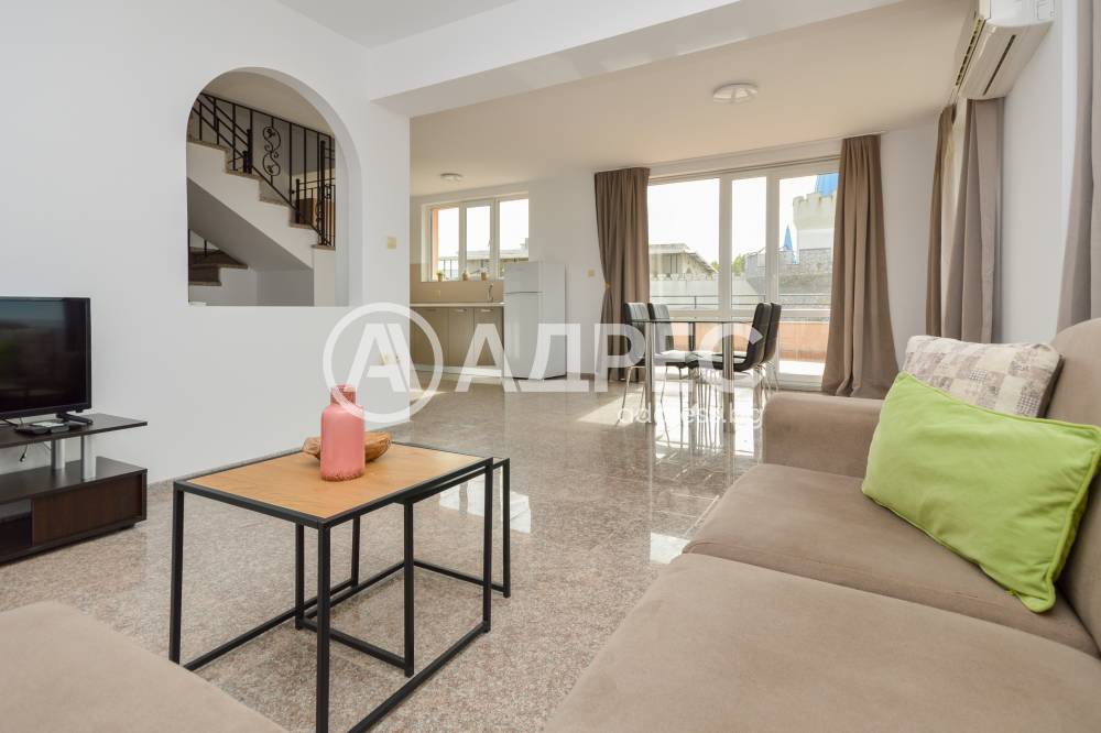 Представяме на вашето внимание просторен тристаен мезонет с площ от 158 кв.м., разположен на 5-ти етаж (с асансьор) в престижен комплекс в к.к. Слънчев бряг — отлична възможност както за сезонно, така и за целогодишно живеене или отдаване под наем.