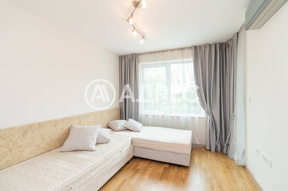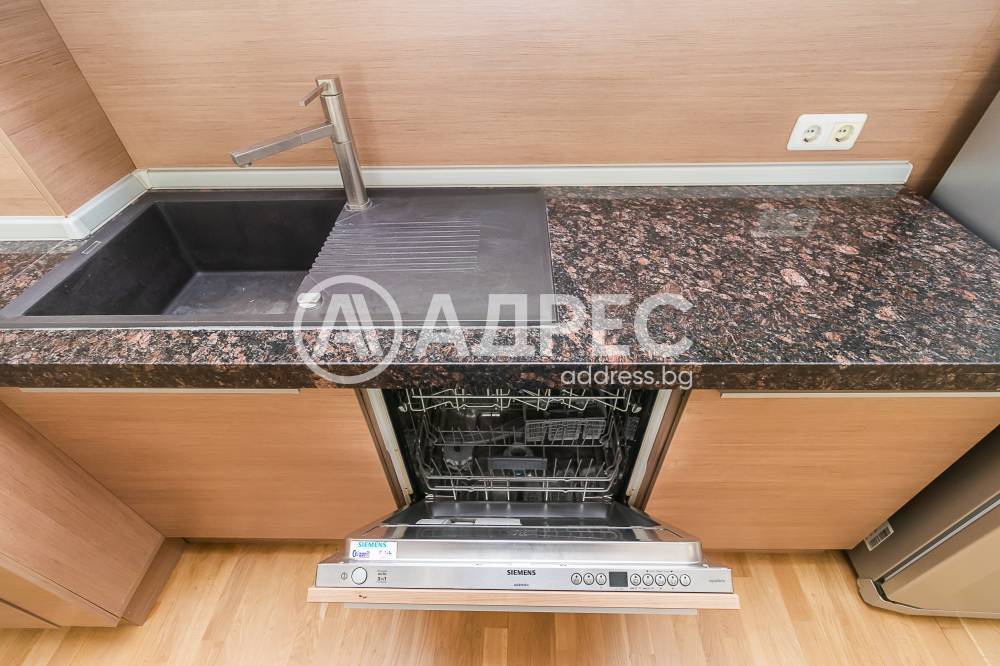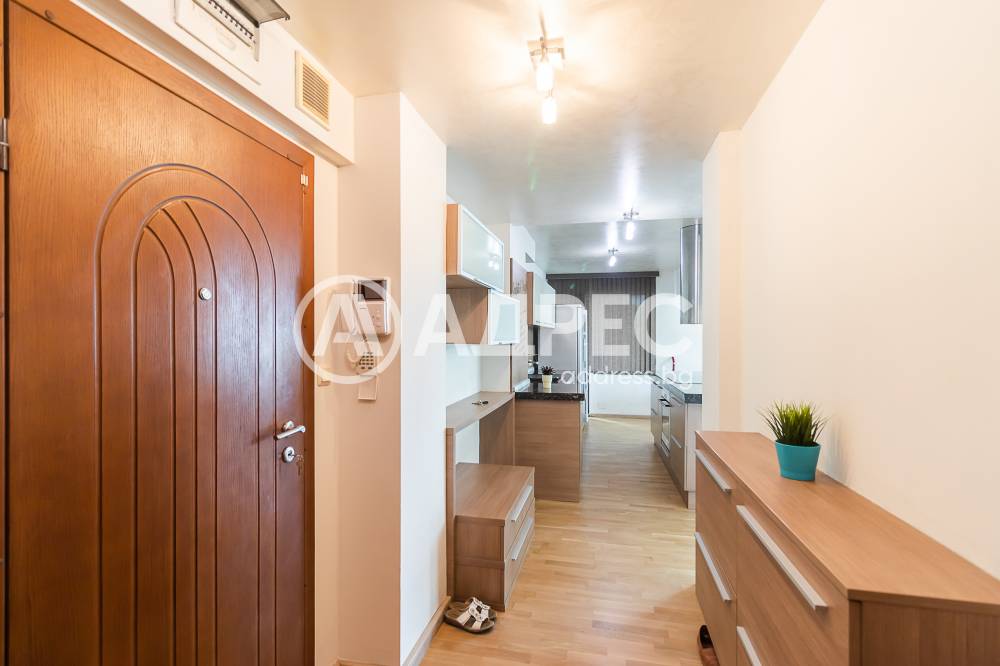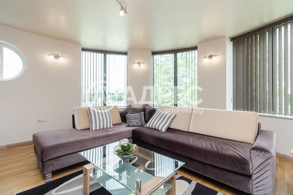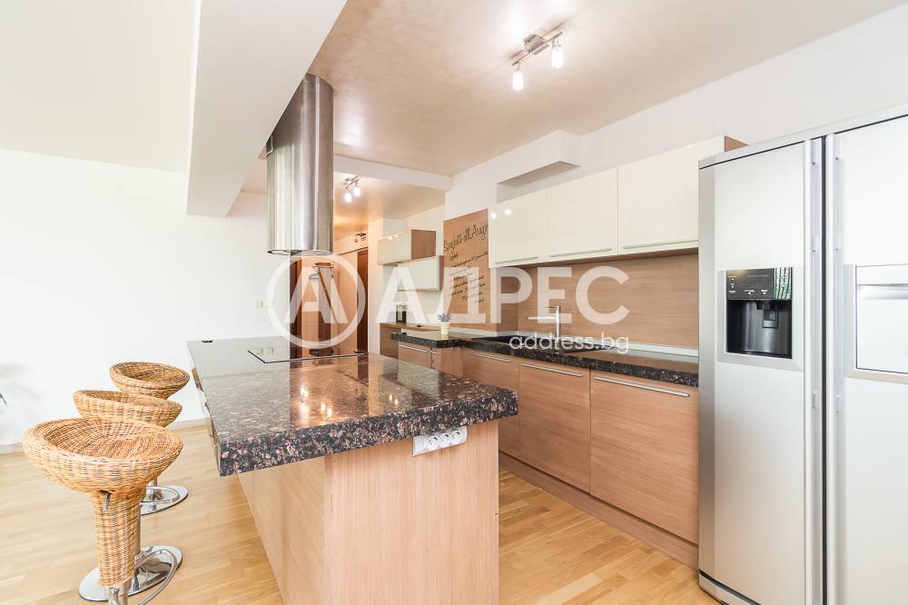 Дизайнерски обзаведен тристаен апартамент, ново строителство. Състои се от просторна дневна /около 50кв. м/ с мека мебел, холна масичка; модерна вградена кухня, оборудвана с бяла техника /вкл.съдомиялна машина/, маса за хранене; две спални със санитарни възли към всяка от тях; две тераси.