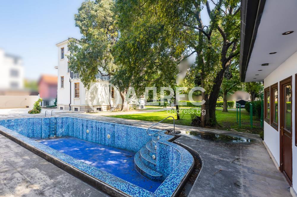 Имотът е разположен в парцел с площ 1950кв.м, в който има голям басейн, поддържана градина, самостоятелна постройка със сауна до басейна, много зеленина, дълго отглеждани дървета. Сградата е на общо четири етажа - на 3 жилищни и един сутеренен - всеки от тях по 266кв.м. Площта е разпределена между голямо фоайе, приемна зала, гостна, обширна трапезария, голяма кухня със самостоятелен изход към двора , 10 помещения, 5 бани със санитарни възли, сутеренен етаж с височина на тавани над 2.60м, три големи помещения, котелно, кухня, санитарни възли, стая за перално помещение, стая за охрана, складови помещения, стая за централно отопление, 3 отделни входа към имота. Състоянието е отлично, възможни са вътрешни преустройства.