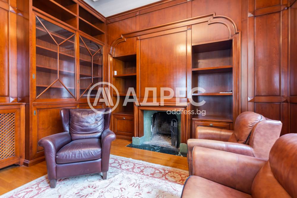 Имотът е разположен в парцел с площ 1950кв.м, в който има голям басейн, поддържана градина, самостоятелна постройка със сауна до басейна, много зеленина, дълго отглеждани дървета. Къщата е на 3 жилищни и един сутеренен етаж - всеки от тях по 266кв.м. Площта е разпределена между голямо антре, вестибюл, гостна, трапезария/ кухня , 10 помещения, 5 бани със санитарни възли, складови помещения, стая за централно отопление, 3 отделни входа към имота. Предлага се частично обзаведена-само с трайно прикрепените мебели /по поръчка/ от масивно дърво. Паркирането е обезпечено за минимум 10 автомобила - закрити паркоместа за 5 автомобила и възможност за паркиране на поне още 5 в открит паркинг.