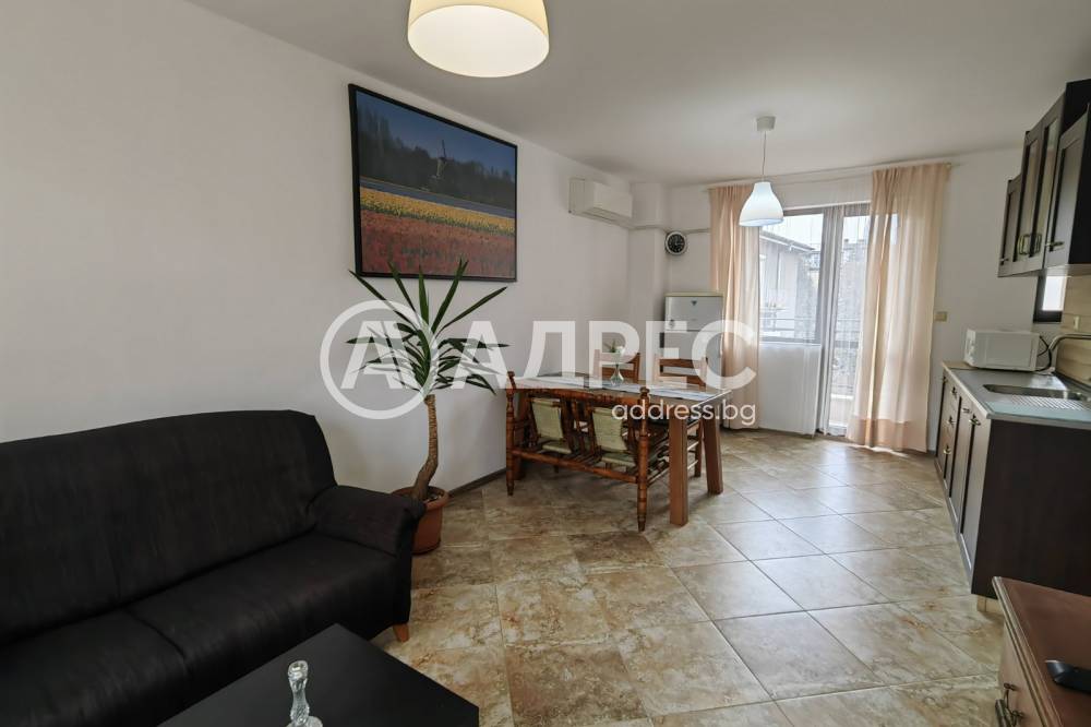 Напълно обзаведен, тристаен апартамент състоящ се от входно антре, 2 спални с легло спалня, просторна дневна с кухня(напълно оборудвана) и трапезария, 2 тераси към дневната, баня с тоалетна.Отоплнието е с климатик в хола и конвектори в двете спални. Чисто и добре поддържано жилище