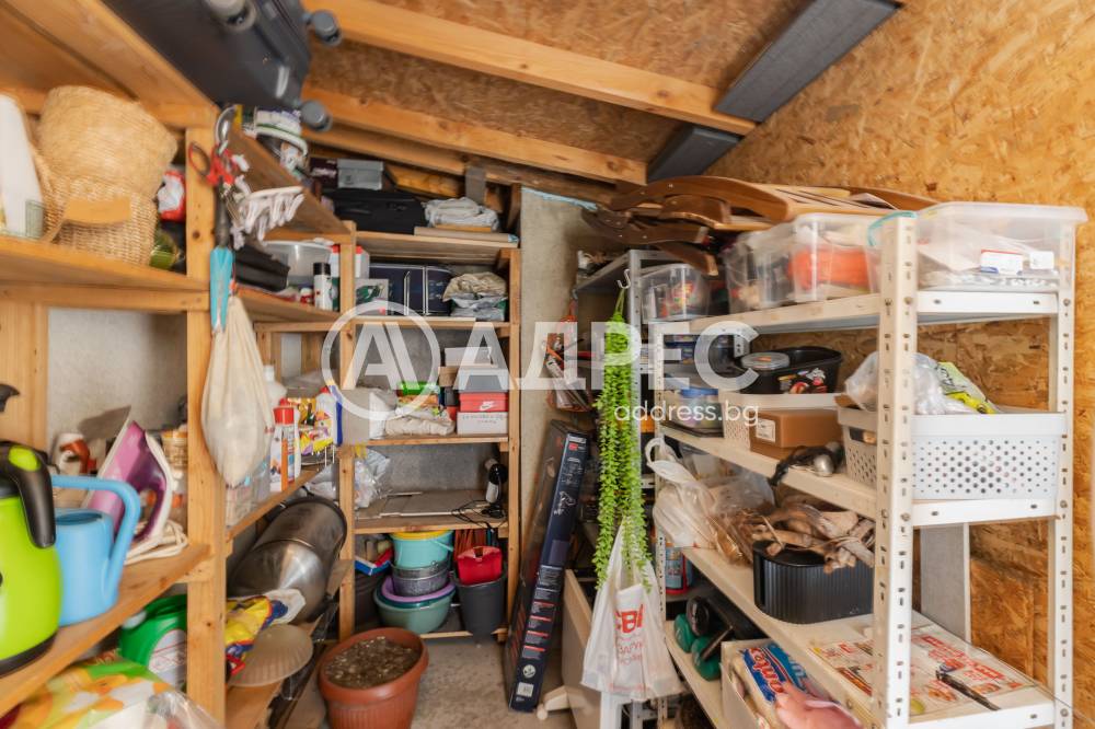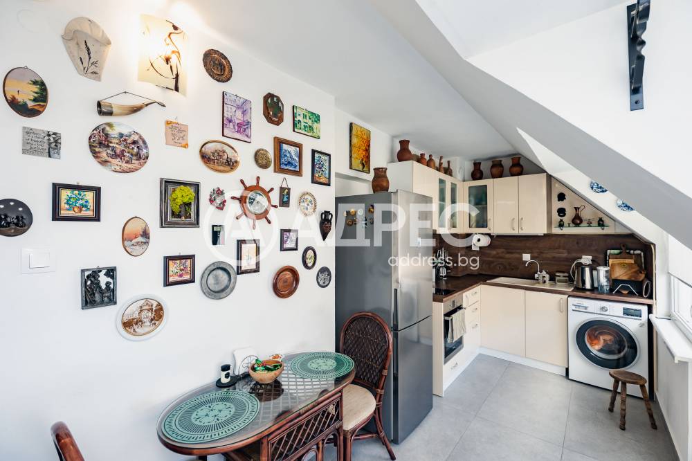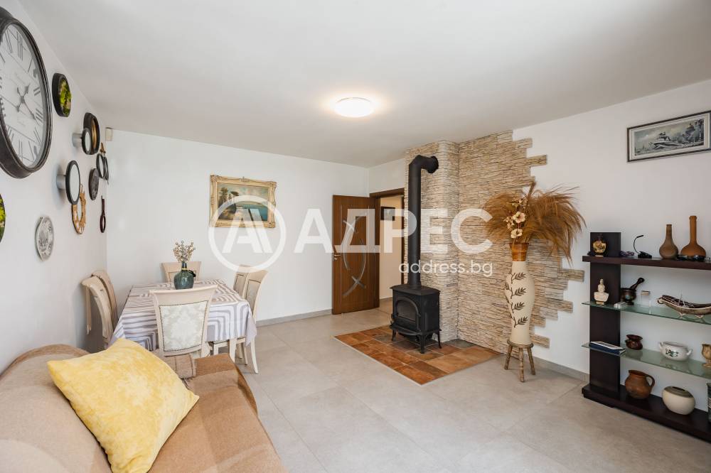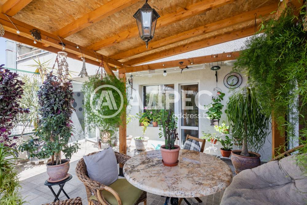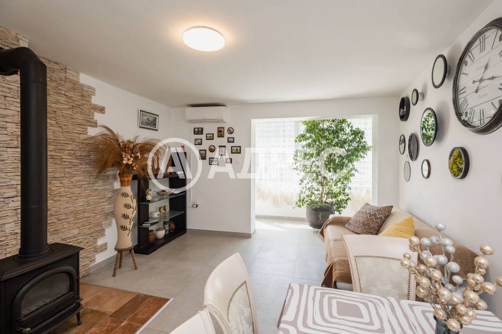 Разпределение: входно антре, дневна с излаз на просторна тераса с навес и лятна градина, отделна кухня с излаз на втора по-малка тераса, спалня, баня с тоалетна, втора спалня с излаз на голямата тераса и килер. Терасата е аранжирана с много цветя и уютен кът за сядане с навес. Към имота има и маза.