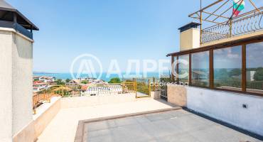 Луксозно завършен тристаен апартамент в квартал Галата с великолепна гледка към град Варна, морето и нос Калиакра. Жилище разположено на последен етаж в пет етажна сграда с асансьор. Апартамент завършен ДО КЛЮЧ, изпълнен с качествени материали и с висока прецизност при строителството. Общата площ на имота е разпределена като жилищна площ 86,76 кв.м. с тераси 24 кв.м., общи части 8,35 кв.м. и 38 кв.м. идеални части от поземления имот. Разпределение дневен тракт с кухня и трапезария, две спални, баня с тоалетна, килер и тераси с нескриваема гледка от всяка стая. Жилищните помещения са оборудвани с петкамерна дограма и подови настилки от естествен дъбов паркет и испански гранитогрес. Апартаментът разполага с климатична инсталация "Дайкин" за отопление и охлаждане, СОТ и пожаро известителна система. Допълнителна площ - покривна тераса от 42 кв.м., която може да бъде превърната в лятна градина или да бъде преустроена в още една стая.
