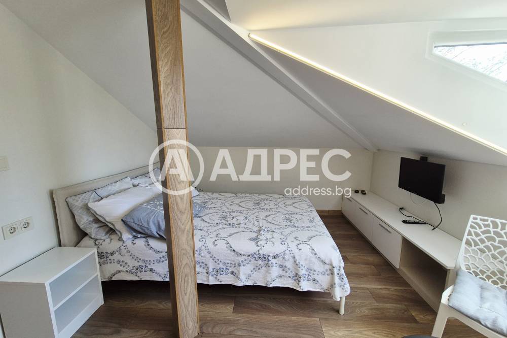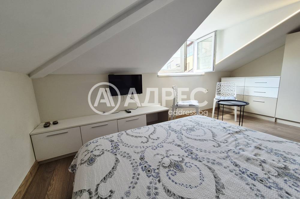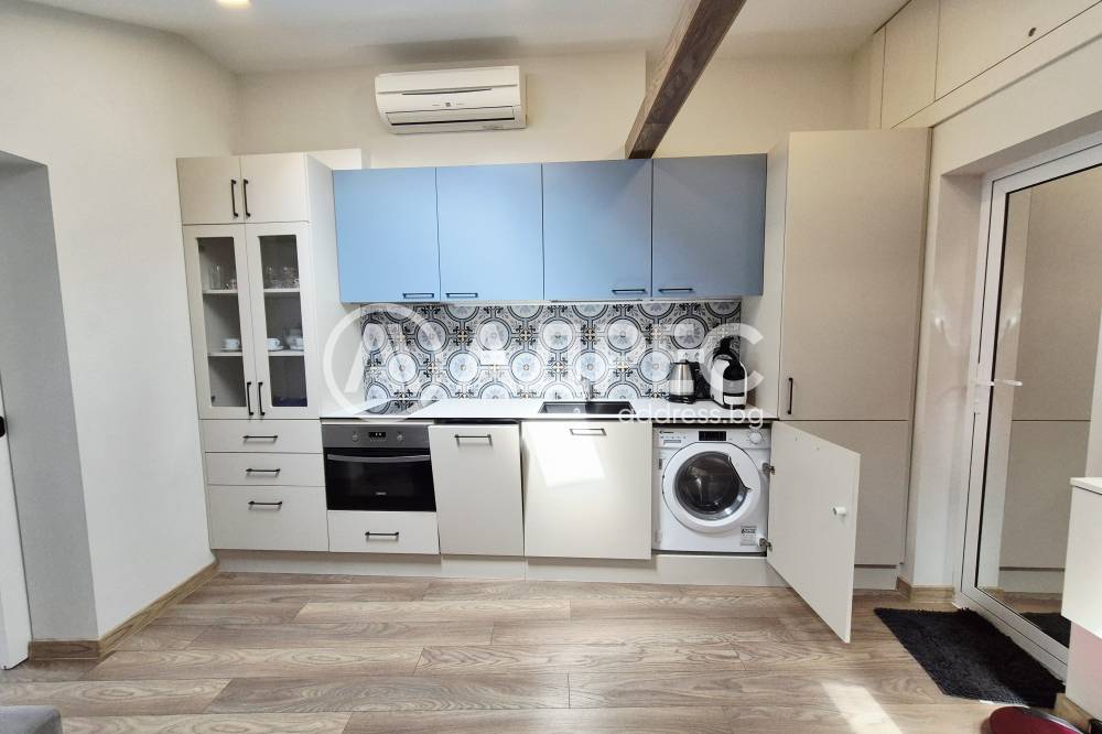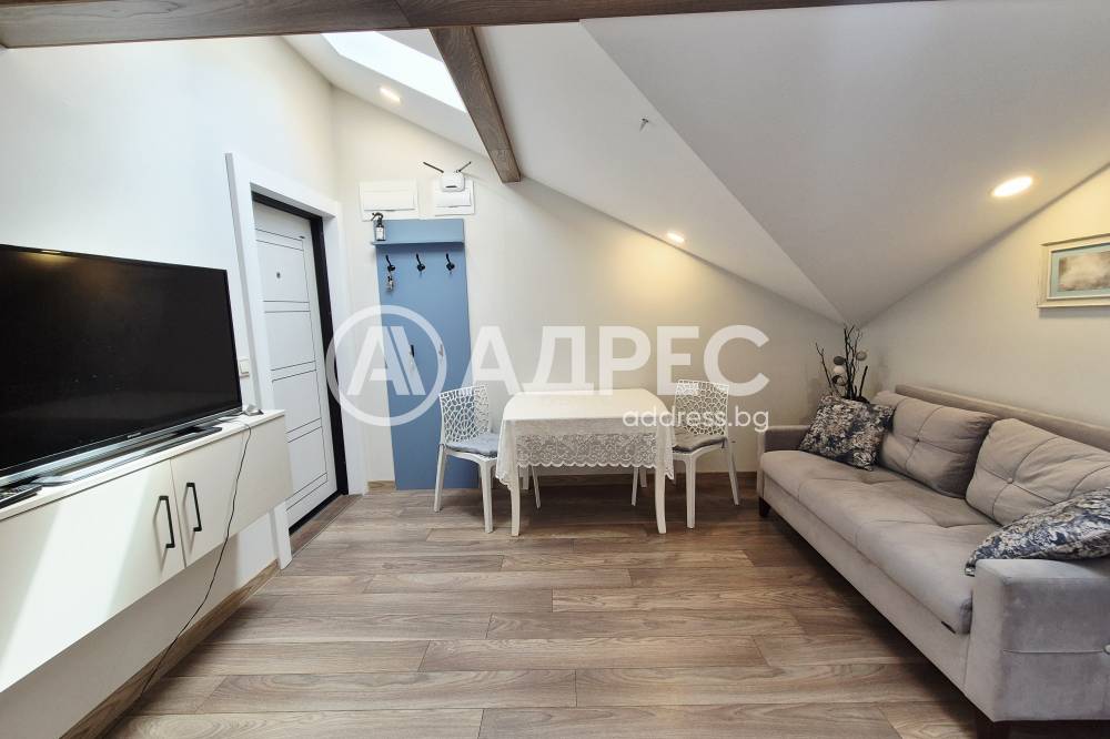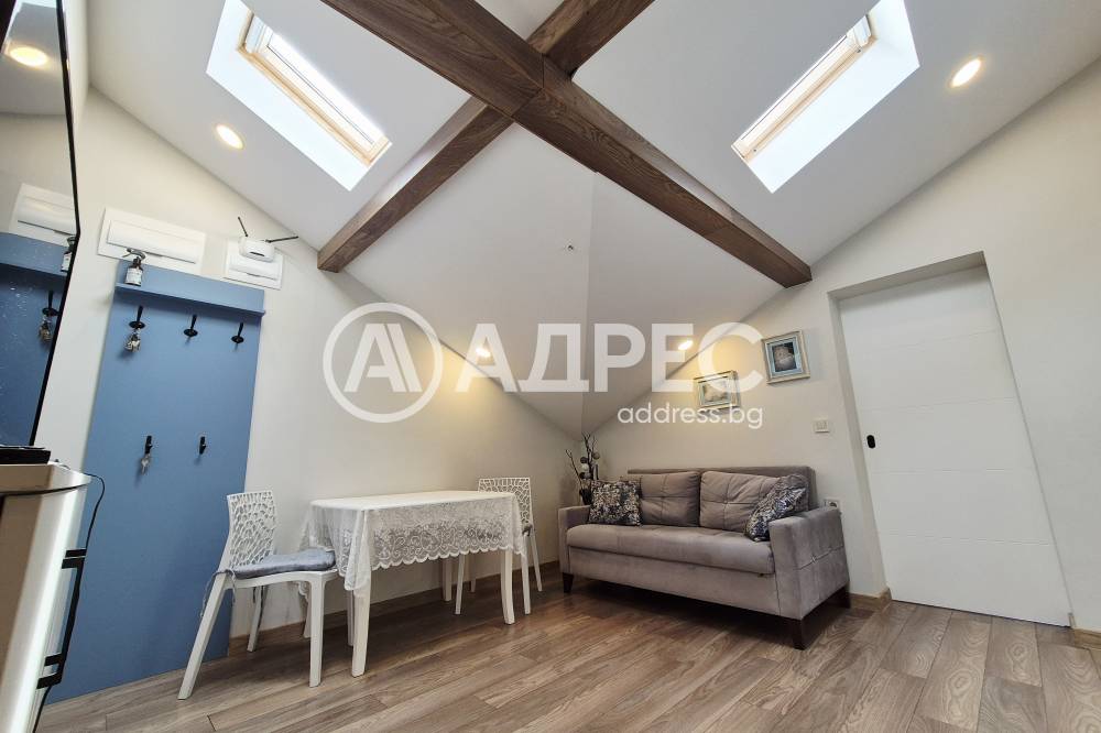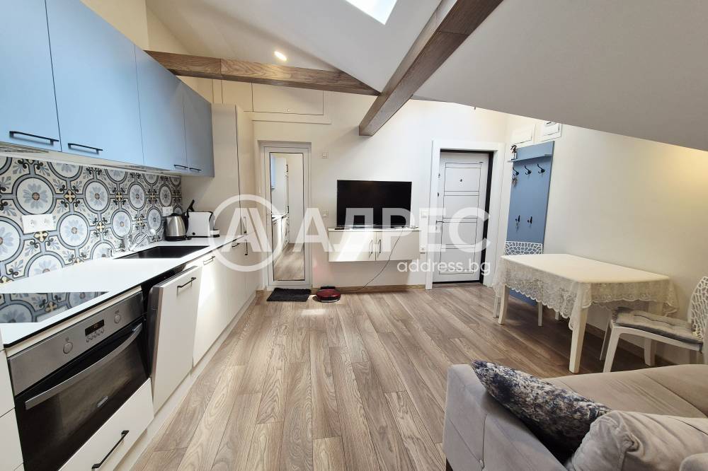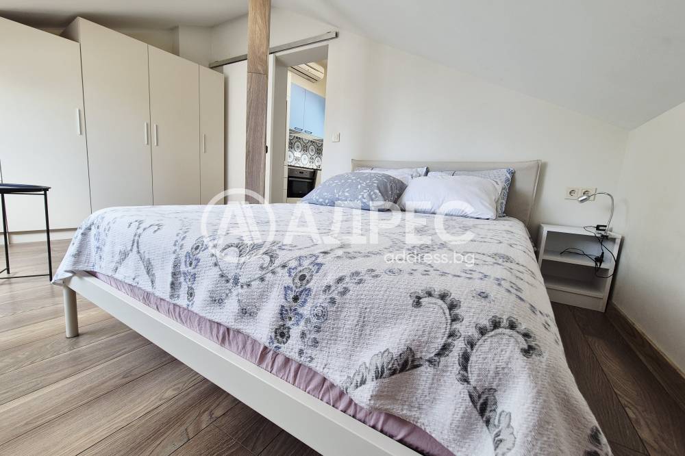 Двустаен, чисто нов апартамент на метри от Морската градина. Жилището е мансарда и е със следното разпределение: всекидневна с кухненска част - бяла техника вкл. съдомиялна, пералня със сушилня, мека мебел, климатик, преходна спалня - легло, гардероб. Баня с тоалет.