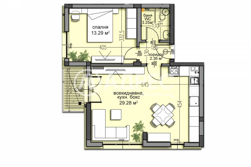 Имотът е с площ 83 кв.м. и се състои се от: входно антре, ОГРОМНА СЛЪНЧЕВА дневна с кухненска част и трапезария и достатъмчно място за зона за релакс, спалня, баня с тоалет, тераса, ведно с прилежащо избено помещение.