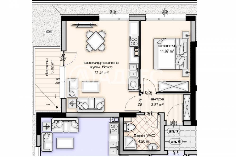 Двустаен апартамент със следното разпределение : антре, дневна с кухненска част, спалня, баня с тоалет и тераса. Възможност за покупка на парко място или гараж.