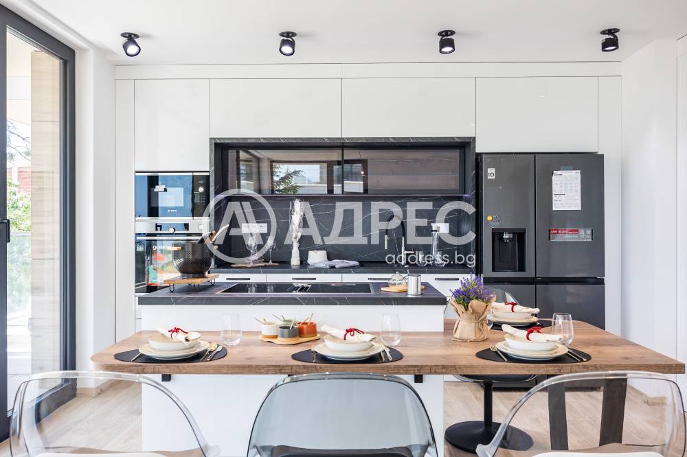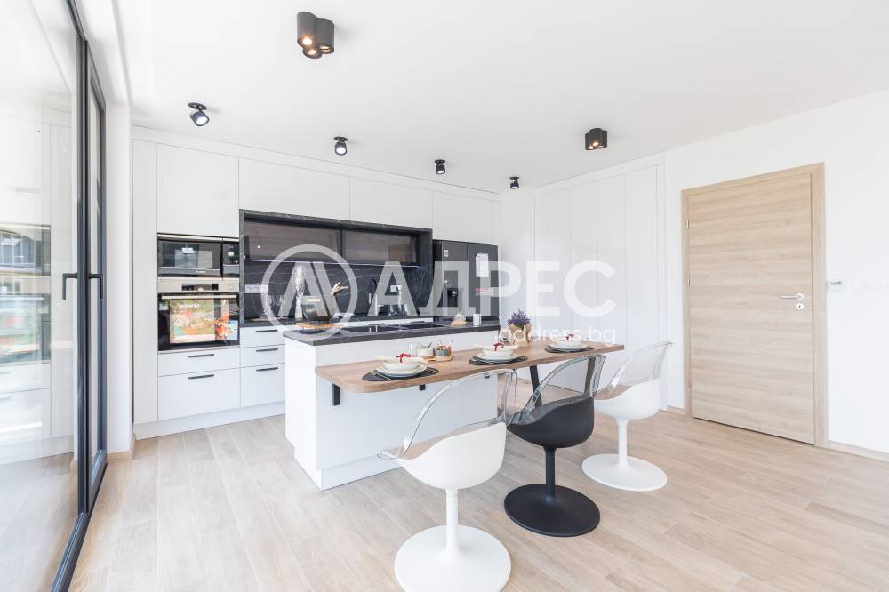 Кухнята е напълно вградена, с дизайнерски аспиратор, интегриран в работния плот, и оборудвана с електроуреди от най-висок клас, което я превръща в истинско удоволствие за готвене и ежедневна употреба.