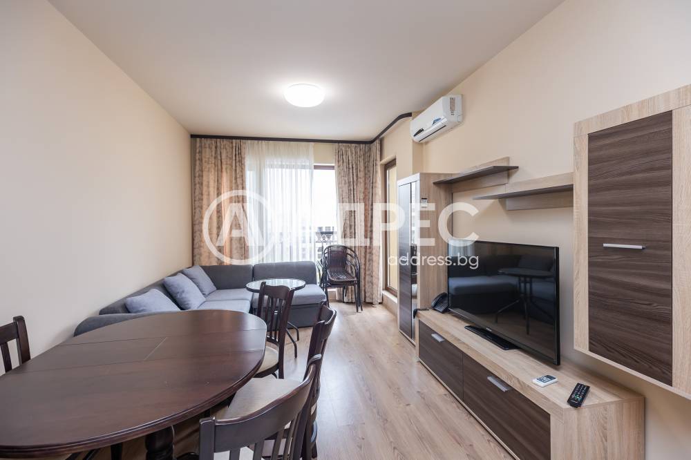Двустаен апартамент, разположен в затворен комплекс в к.к. „Златни пясъци“, с площ от 75 кв.м. Снимките са илюстративни, но обзавеждането е еднотипно за целия к-с. Имотът е напълно обзаведен и оборудван, с модерен интериор и функционално разпределение. Състои се от просторна дневна с кухненска част, спалня, баня с тоалет и балкон с приятна гледка към външните басейни. Кухнята е оборудвана с всички необходими електрически уреди, а в хола има удобни мебели и техника за отдих.