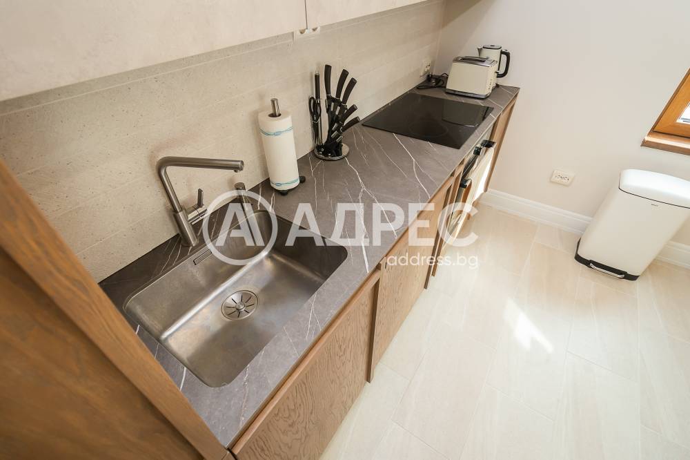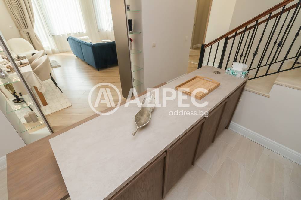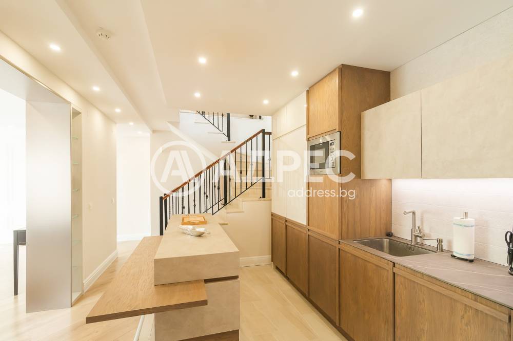 На първо ниво е разположено антре, голям дневен тракт с обособени зони за релакс с модерно обзавеждане и камина, трапезария и кухненнска част изпълнена от водеща в бранша компания, всички необходими уреди. На етажа има спалня и санитарен възел и прекрасна голяма тераса.