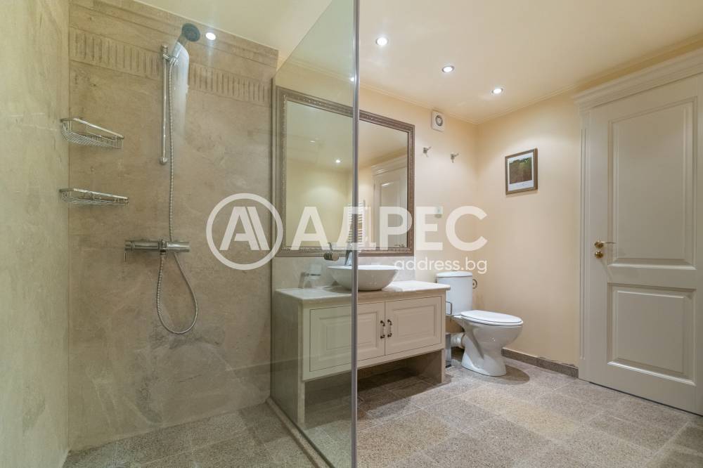 Първи етаж: три големи спални, всяка със самостоятелна баня с тоалетна и излаз към дворна тераса, килер, широк коридор, вътрешно стълбище.