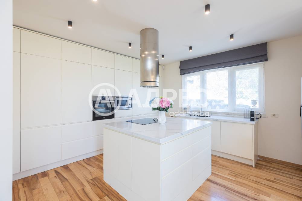 Голяма дневна с високи тавани и директен достъп до двор и басейн, кухня с остров и трапезария, напълно оборудвана с висок клас уреди с достатъчно пространство за семейни събирания. Четири просторни спални, изпълнени със светлина и уют, едната от тях със собствена баня и гардеробна, втора модерно оборудвана баня, тоалетна, перално помещение.