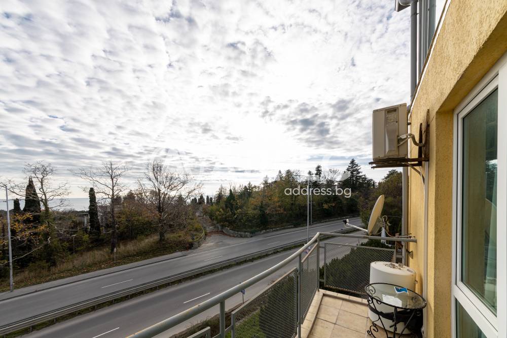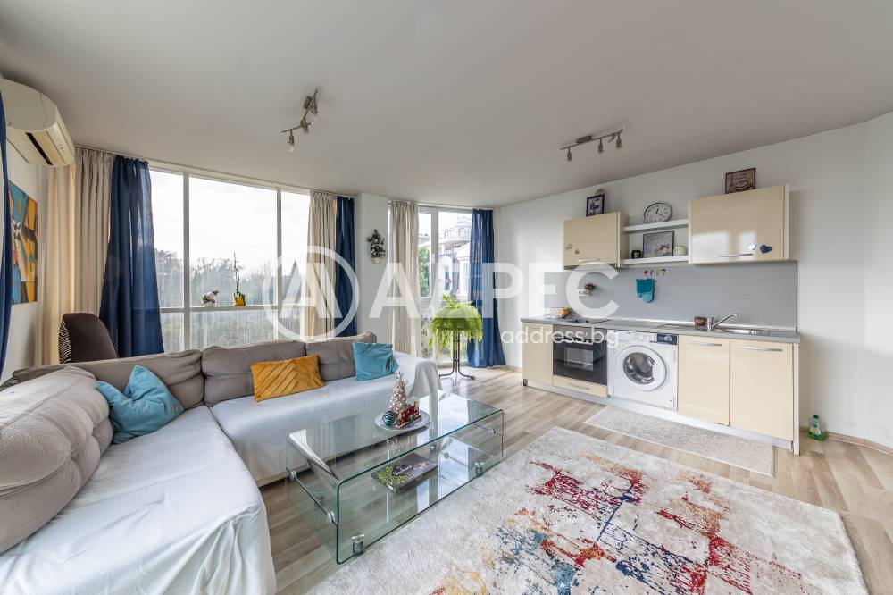 С морска панорама и паркомясто. Двустаен тухлен апартамент разположен на среден етаж в малка сграда с асансьор . Имота се състои от: Дневна с кухня и трапезария, една спалня, баня с тоалетна,коридор,тераса. Към имота има регламентирано и запазено паркомясто в цената на имота.