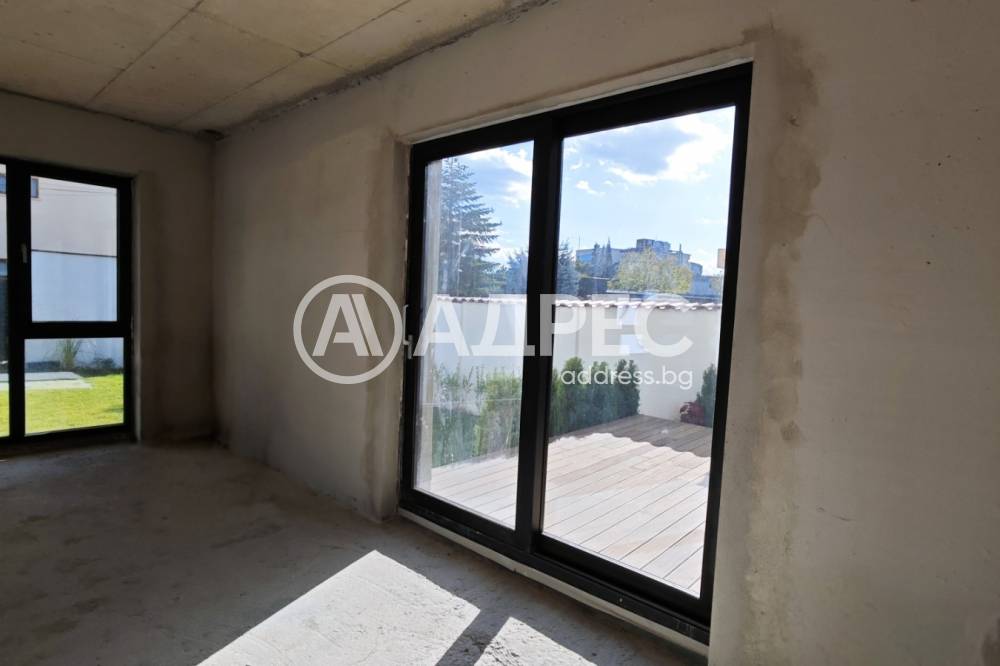 Първи етаж - Голямо антре, което ни отвежда към просторна всекидневна от 60 квадратни метра, която служи като идеално място за събиране на семейство и приятели, включвайки големи френски прозорци, с алуминиева дограма, троен стъклопакет 4 сезона 52мм, които позволяват изобилие от естествена светлина и достъп през "хебешибе/ lift and slide система, до 20 кв.м веранда с естествен декинг. На етажа са ситуирани също така санитарен възел и килер.