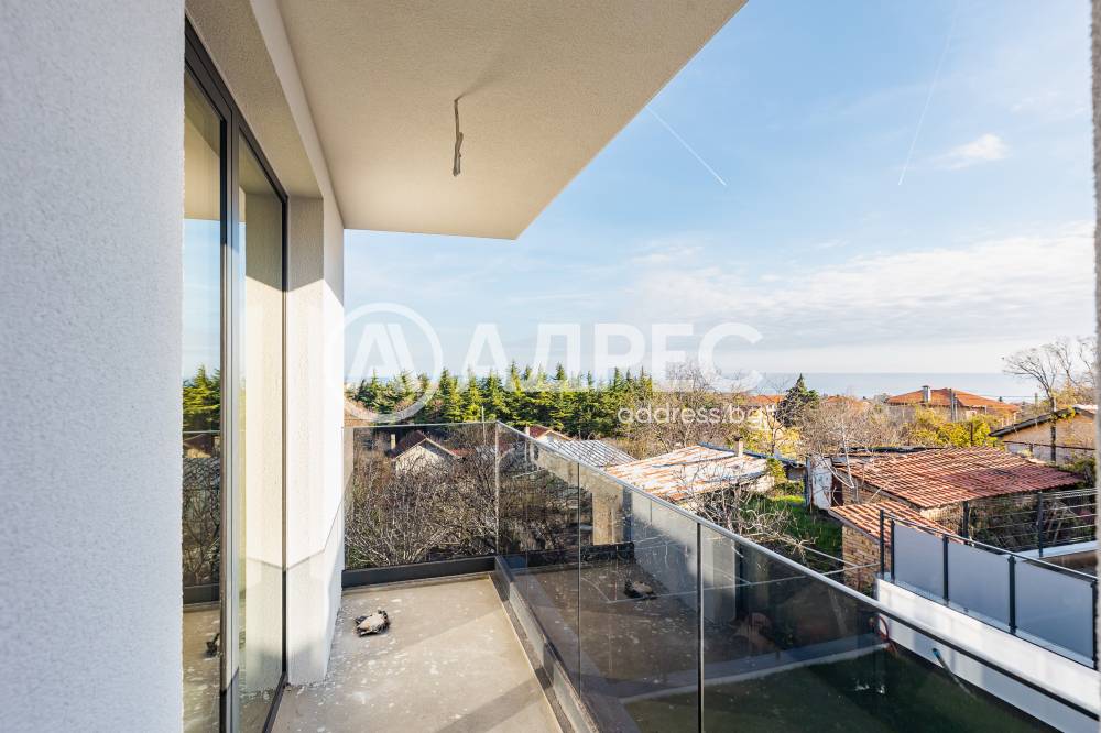 Втори етаж: три спални, баня с тоалет, тераса с частична морска панорама.