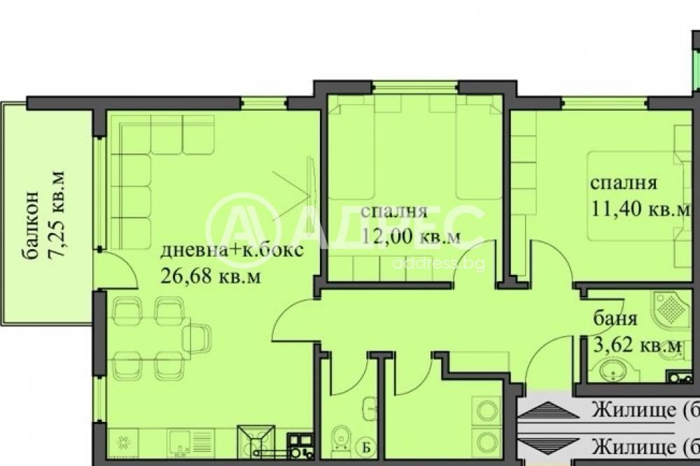 Тристаен апартамент със следното разределение: антре, баня и тоалетна, втора тоалетна, перално + килер, хол с кухненски бокс, две спални и балкон.