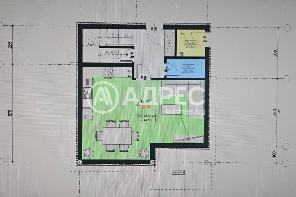 Етаж 1: Слънчева всекидневна с кухненска част и веранда отпред, тоалетна и илер.