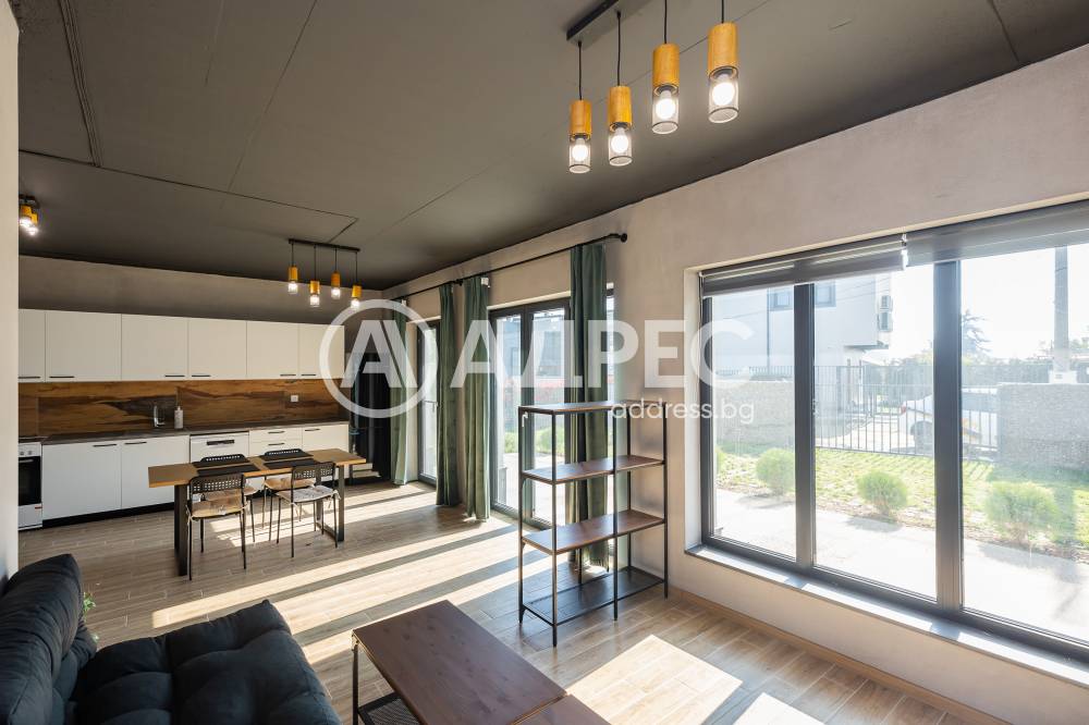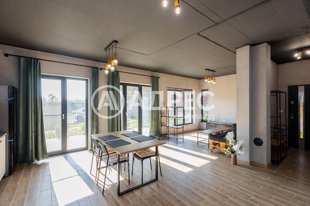 Първи етаж: Просторна дневна с големи прозорци и директен излаз към двора, тоалетна, сервизно помещение, коридор и склад с две врати – една към коридора и една към двора.