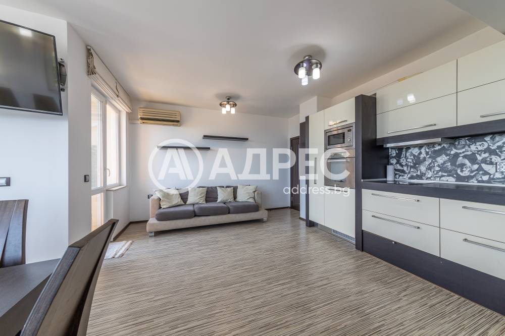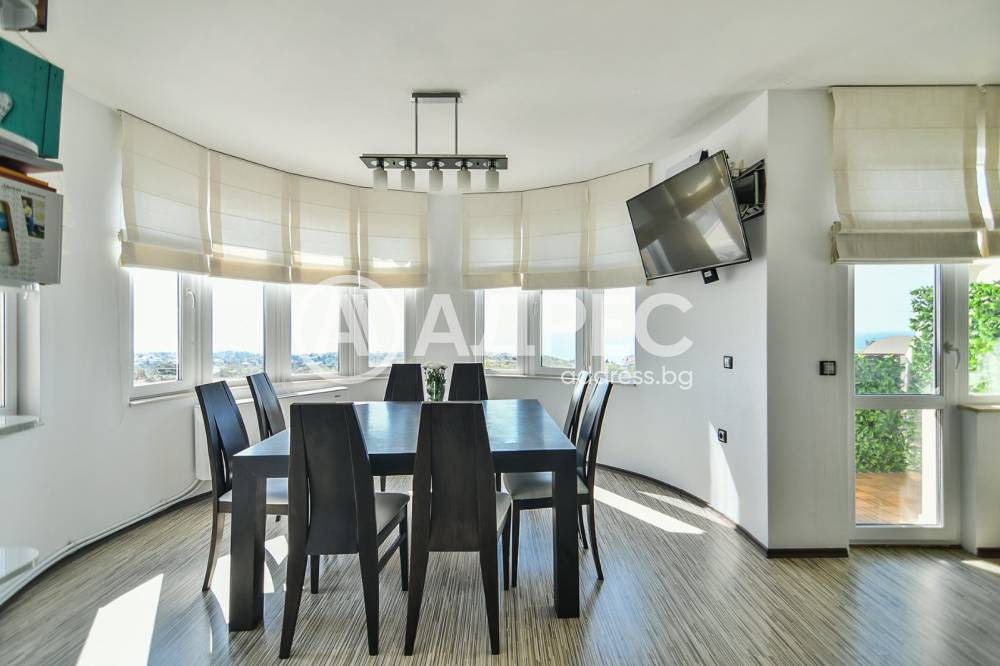 Напълно обзаведен тристаен апартамент с югоизточно изложение и прекрасна морска панорама. Жилището се състои от голям дневен тракт с оборудвана кухня, две спални, баня с тоалет, коридор, тераси и мазе. Жилището е топлофицирано с пелетен котел, радиатори във всички помещения и лира в банята, комбиниран бойлер, отделно климатици във всяка стая. Висок клас дограма с двоен стъклопакет енерджи стъкла. Инсталирана е система за пречистване на питейната вода с обратна осмоза. СОТ с датчици на всички външни врати и противопожарен датчик.