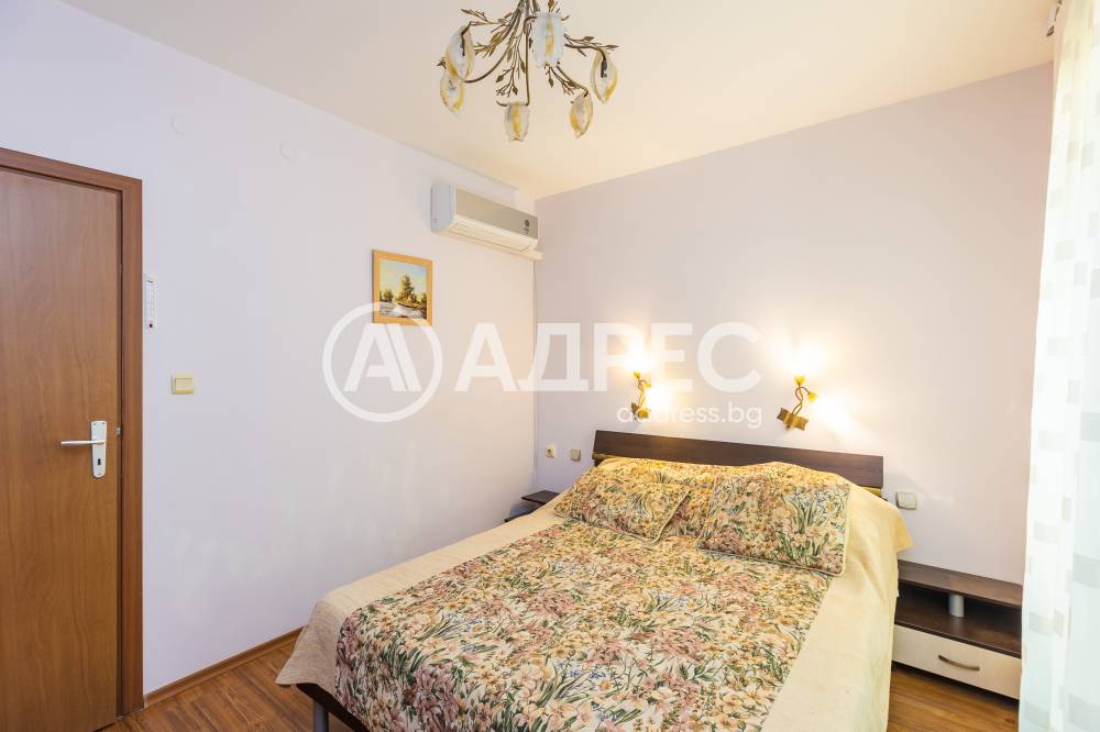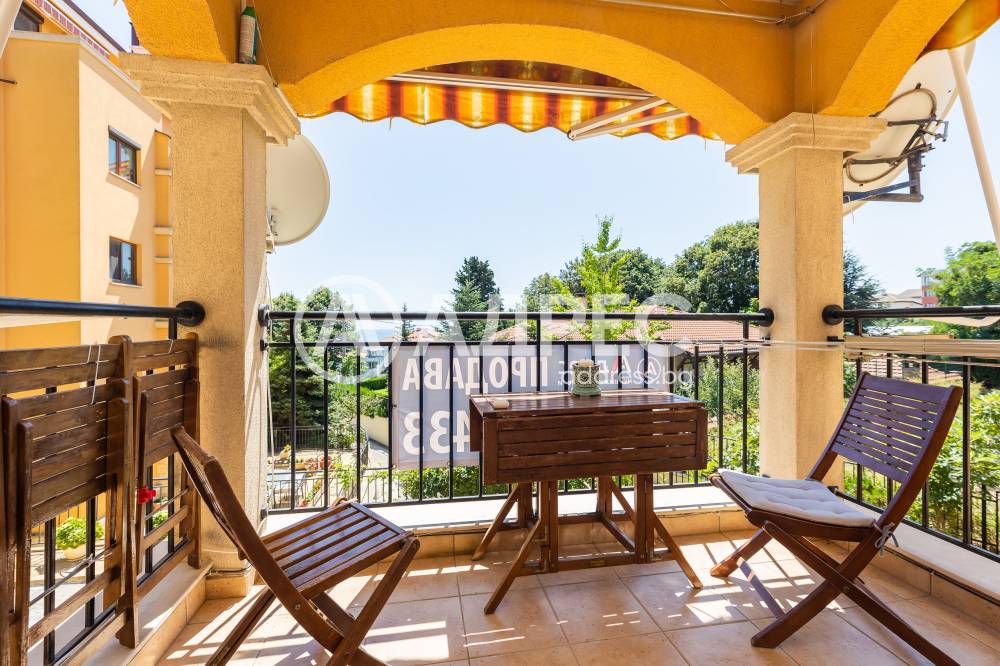 Тристаен обзаведен апартамент на среден етаж с южно изложение и морска гледка. Имотът се състои от коридор, две спални, всекидневна с кухненски бокс, баня тоалет, отделно тоалет, перално помещение и тераса. Към него има и мазе, както и възможност за покупка на гараж с цена 20 000 €.