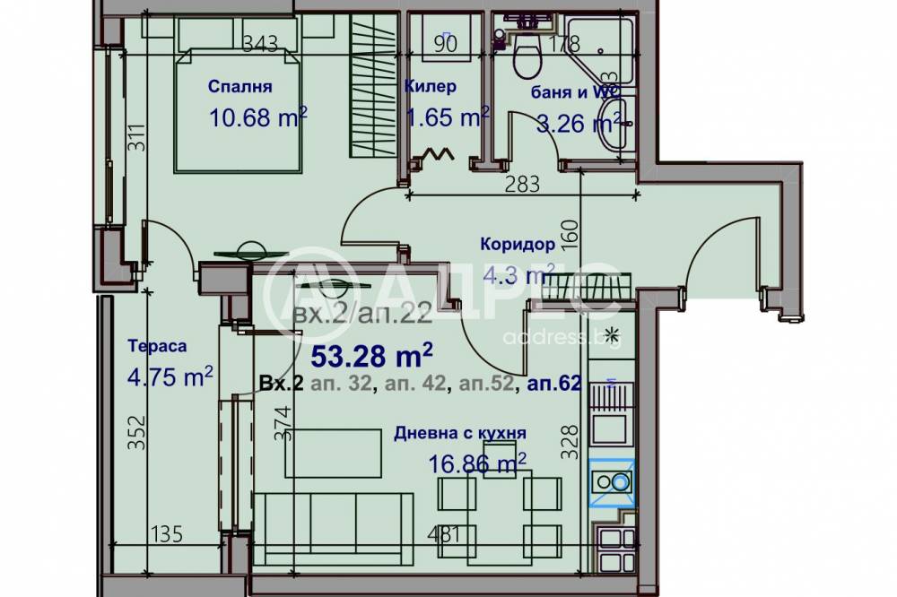 Входно антре, дневна с кухненска част, уютна спалня, санитарен възел, килер, тераса достъпна от двете стаи. Апартаментът се предлага в степен на завършеност по БДС – циментова замазка на пода, шпакловка на стените, PVC дограма и блиндирана входна врата.