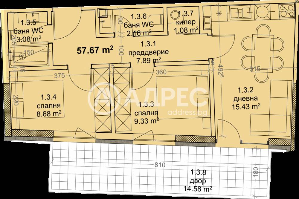 Апартаментът е с обща площ от 70 кв.м + 15м2 двор и се състои от: