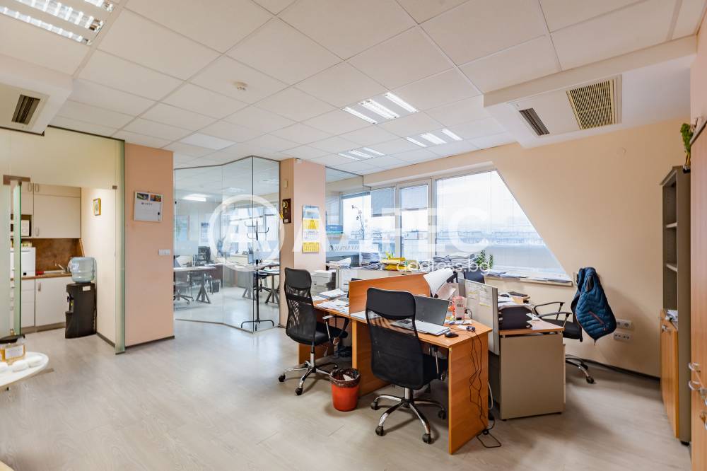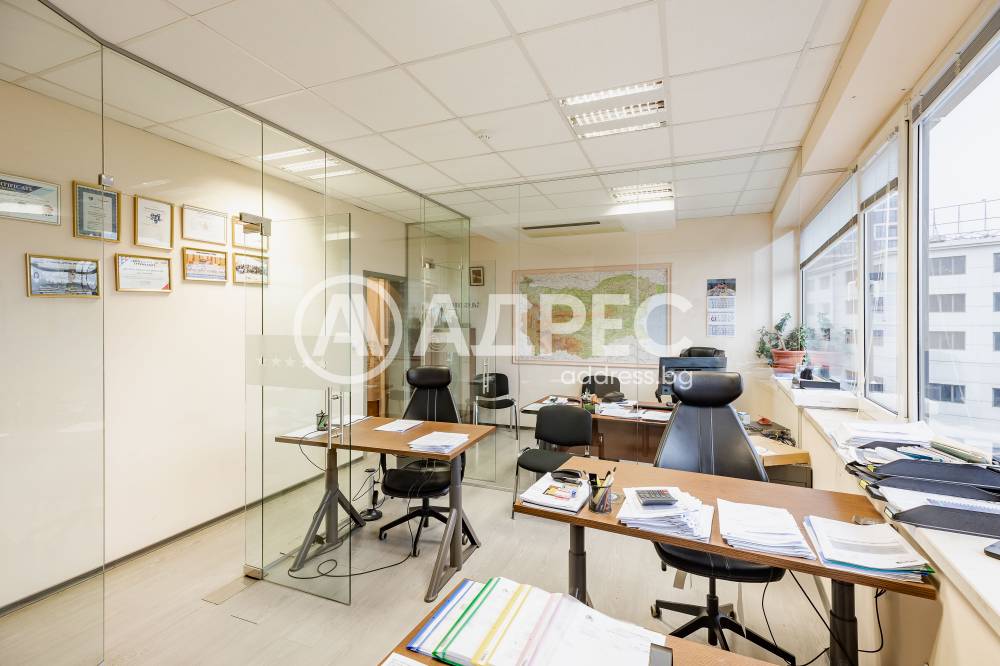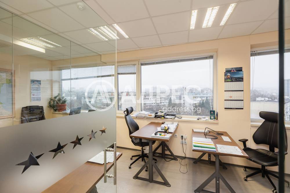 Просторен офис 105 кв.м., разделен на работни кътове, складово помещение, мини бокс и баня с тоалет. Помещението се предлага обзаведено, с климатици, сот система, интернет. Може да бъде наето от първи април 2026 г.