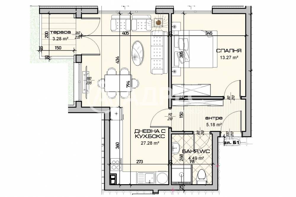 Жилището се състои от входно антре (коридор), което осигурява удобно разпределение към всички помещения. Просторната дневна с кухня и трапезария е проектирана като светло и приветливо общо пространство с възможност за обособяване на различни функционални зони. Спалнята предлага уют и спокойствие, подходящи за пълноценна почивка.