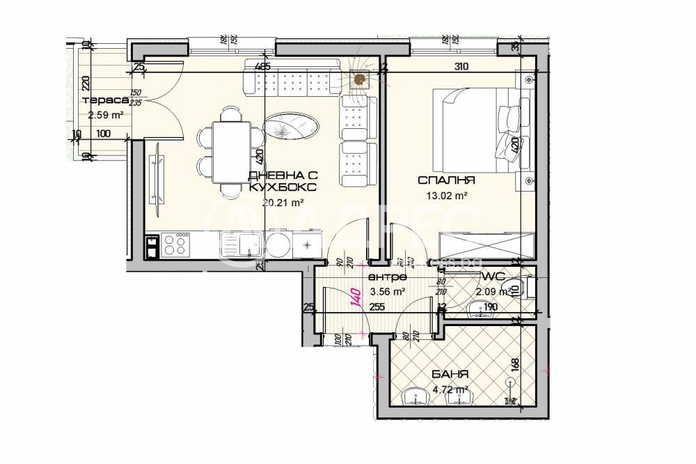Апартаментът разполага със санитарен възел в оптимален размер, маза с добри размери за удобство и практично съхранение.