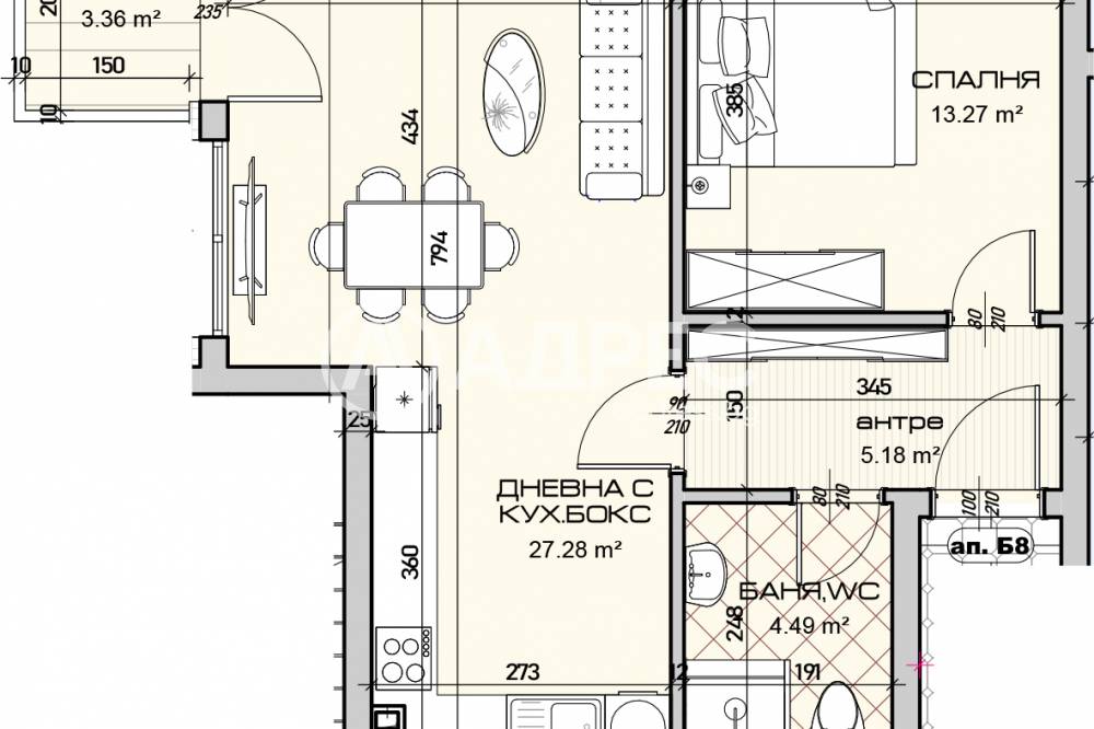 Апартаментът разполага със санитарен възел в оптимален размер, маза с добри размери за удобство и практично съхранение.