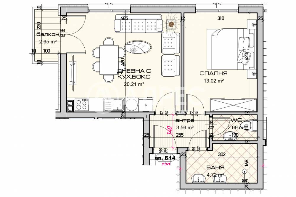 Апартаментът разполага със санитарен възел в оптимален размер, маза с добри размери за удобство и практично съхранение.