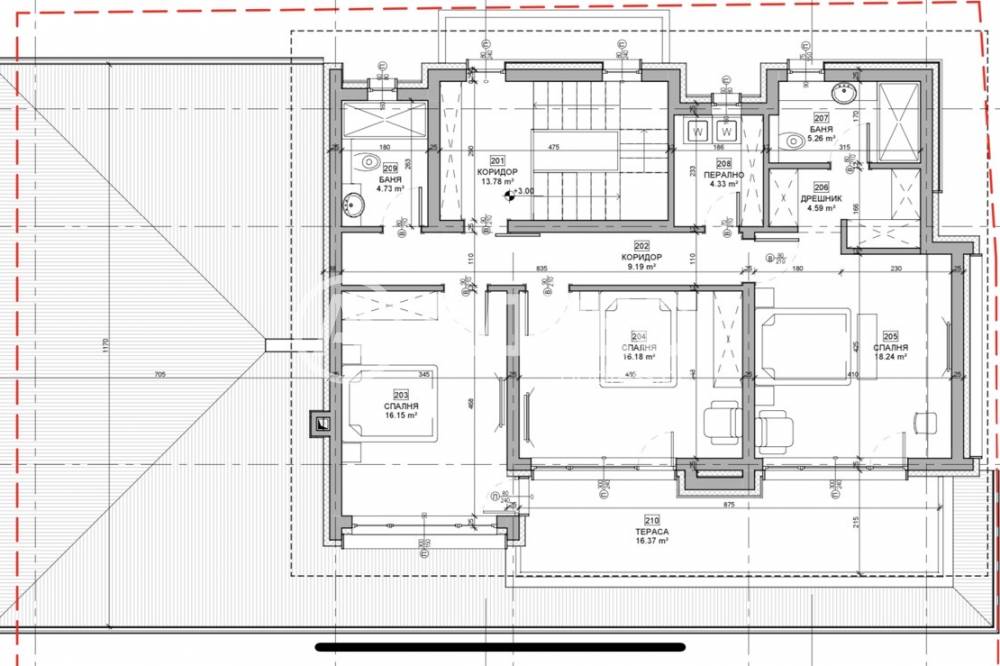 Къщата разполага с дневен тракт 50 кв.м., 4 спални едната от които е със собствена баня и гардеробна, 3 бани с WC, перално помещение, офис помещение, техническо помещение и двоен гараж. Към дневната и кухненската част има прилежащ килер за посуда и продукти. Всички стаи имат излаз на тераса. Прекрасна веранда с изглед към двора с обособени места за трапезарна маса и кът с мека мебел.