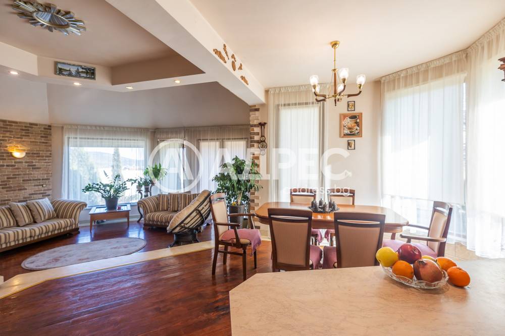 Монолитна жилищна сграда на три нива. Облицована с камък фасада на първото ниво. Голям гараж и открити паркомeста. Професионално озеленен и отлично поддържан двор с каменни настилки. Локално парно, подово отопление, климатици в стаите.