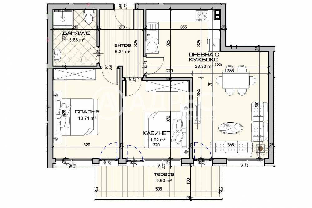 Жилището разполага с просторна всекидневна с кухня и трапезария, проектирана като светло и широко общо пространство – идеално за семейни събирания и уютни вечери у дома. Двете самостоятелни спални осигуряват необходимото уединение и спокойствие, подходящи както за семейство с дете, така и за обособяване на кабинет или гостна стая. Апартаментът предлага баня с тоалетна, както и маза, която гарантира удобство и функционалност в ежедневието. Просторна тераса, която осигуряват допълнително външно пространство и възможност за отдих.