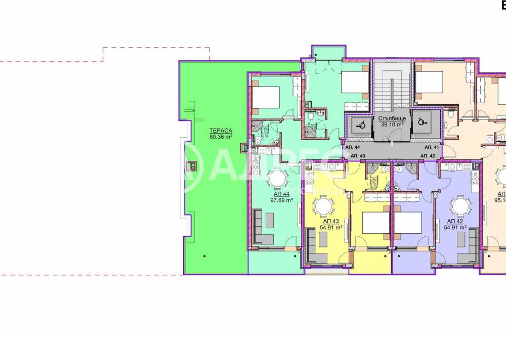 Сградата е разпределена в 79 апартаменти и 77 паркоместа.